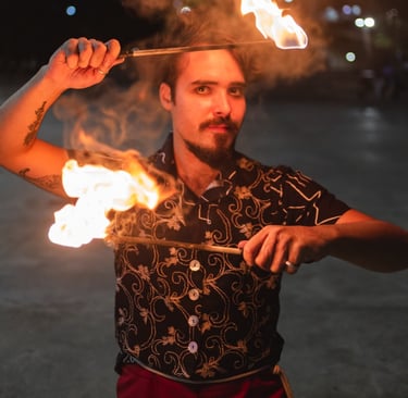 iniciei minha trajetória com a pirofagia em 2021 com dois artistas. Luix Equixx, artista circense carioca, que me ensinou a manipular o fogo no corpo, y Gaspar Olivares, artista circense chileno que me mostrou o caminho da dança com o fogo.