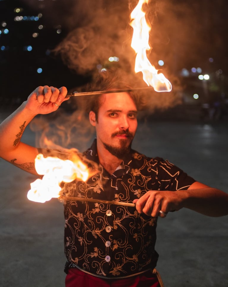 dentro de minhas habilidades com este elemento cito: dança com o fogo, produção de manoplas de fogo, manipulação do fogo no corpo, lamber o fogo, cuspir y engolir o fogo.